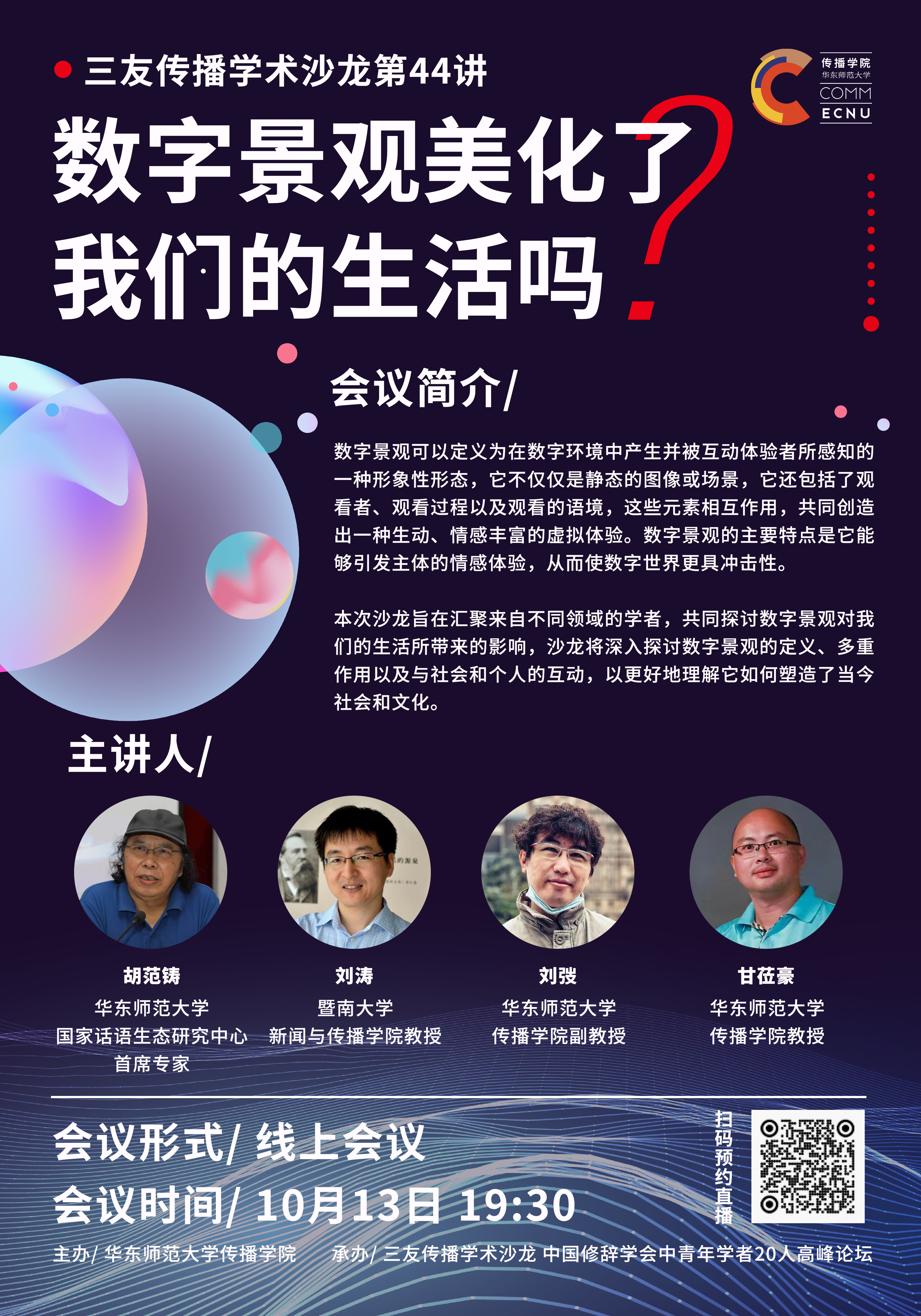 本次沙龙旨在汇聚来自不同领域的学者,共同探讨数字景观对我们的生活所带来的影响,沙龙将深入探讨数字景观的定义、多重作用以及与社会和个人的互动,以更好地理解它如何塑造了当今社会和文化。