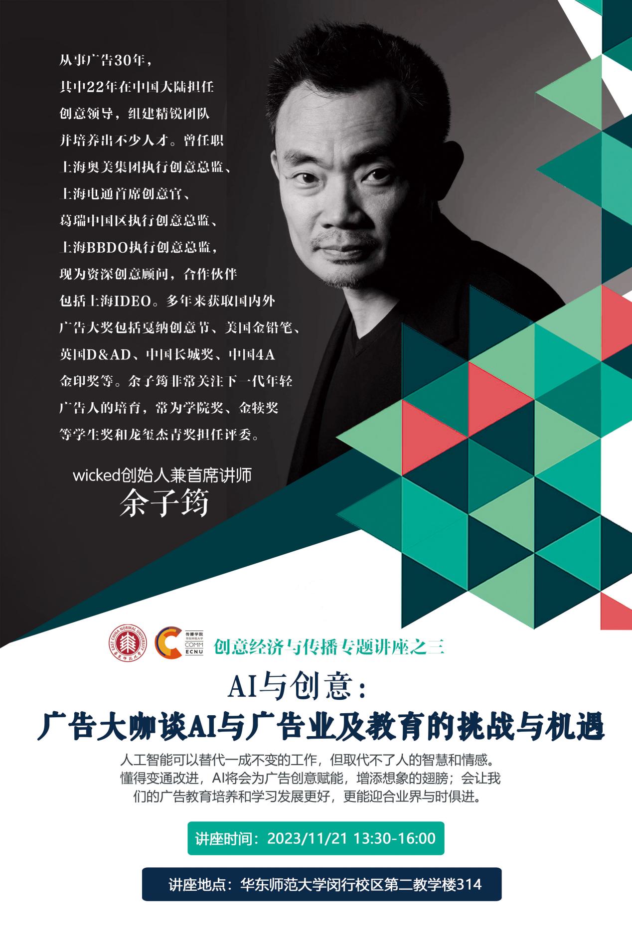 余子筠,新加坡人,从事广告30年,其中22年在中国大陆担任创意领导,组建精锐团队并 培养出不少人才。曾任职上海奥美 集团集团执行创意总监、上海电通首席创意官、葛瑞中国区执行创意总监、上海BBDO执行创意总监,现为资深创意顾问,合作伙伴包括上海IDEO。多年来获取国内外广告大奖包括戛纳创意节、美国金铅笔、英国D&AD、中国⻓城奖、⻰玺 广告奖、中国4A金印奖、中国金铅笔奖、亚太区Spikes广告奖、纽约广告节等,也为各大赛事当评委。余子筠非常关注下一代年轻广告人的培育,常为学院奖、金犊奖 与金铅笔奖等学生奖和⻰玺杰⻘等担任评委。由于曾经留学美国首屈一指的ArtCenter (艺术中心学院),并任职波士顿和伦敦广告公司,余子筠经历了与国内截然不同的创意培训模式。他相信年轻人的创意潜能是应该尽早被发掘并给予模拟业内实战式培养的。他不认为创意专业应该只教学生一技之⻓,而应该给予充足的创作思考锻炼,以满足广告和创意行业内迫切需求。对余子筠来说,大胆的创意思维才是一个创意新人能带给行业最大的值。